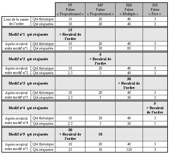 Les différentes modifications et les recalculs des ordres sont donnés par le tableau ci-dessous. On part d'un ordre ou toutes les lignes ont un mode de production avec la caractéristique "Calcul ordre selon composant" cochée.