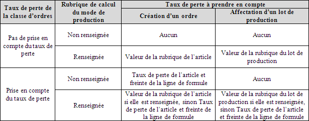 Cette case, si elle est cochée, permet de préciser que lors de la création d'ordres à partir d'une formule ou lors de l'affectation des lots de production, il faudra prendre en compte le taux de perte de l'article de la ligne d'ordre.