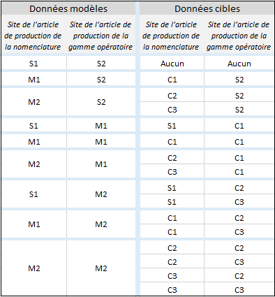 L'identification des données cibles dépend de la combinaison des paramétrages existant pour les deux sites de production de la donnée prise comme modèle.