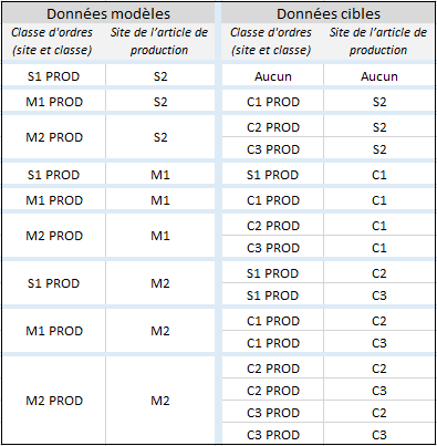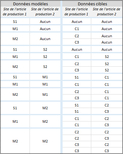 Dans les exemples de données modèles et cibles, les articles de production 1 et 2 sont toujours identifiés par les mêmes code article, catégorie et filière.