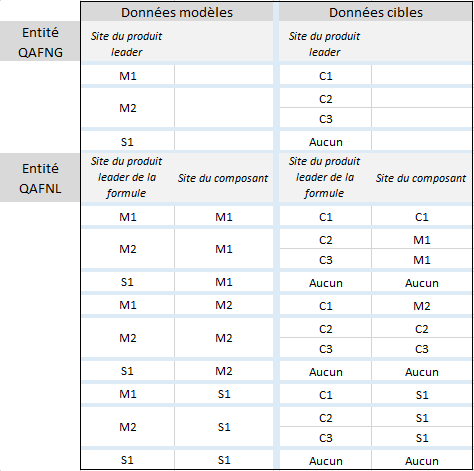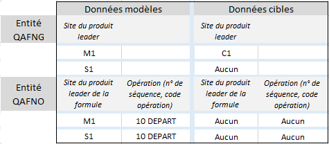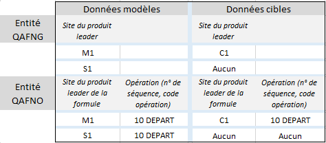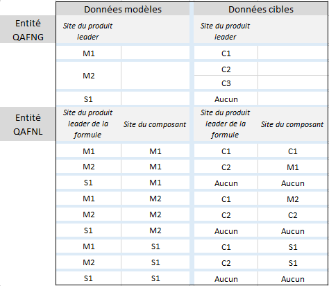 Entité "QAFNG" : pour le site de production modèle "M1", un seul site de production cible "C1".