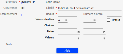 - I : la valeur de l'indice est indiquée dans la valeur 1 de l'occurrence. Les dates 1 et 2 définissent la période de validité de la valeur de l'indice.