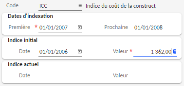 Lors de l'initialisation de l'indice, l'indice actuel n'est pas renseigné. L'indice actuel est calculé lors de la révision des éléments financiers.