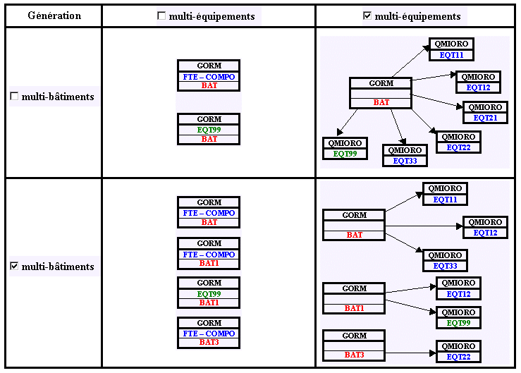 ... voici les différents résultats pouvant être obtenus suivant le paramétrage Génération multi-équipements et Génération multi-bâtiments saisi.