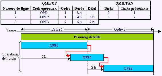 La date et l'heure de début théorique de l'opération OPE3 seront égales à la date et à l'heure de début théorique du planning détaillé, en ajoutant la durée de l'opération OPE1 et le délai de 2h.