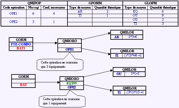 Pour ce qui est des ressources (moyen à consommer de type "TI"), le coefficient ressources du plan d'opération (QMIPOP) est à appliquer. Ce coefficient étant dépendant du nombre d'équipements du plan d'opération, la quantité de ressource à affecter à la ligne d'opération de l'ordre sera donc à multiplier par le quotient coefficient ressource/nombre d'équipement du plan d'opération.
