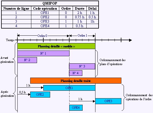 Au moment de la génération du planning (TGPP), la durée du planning détaillé dépend de la durée des opérations spécifiées au niveau des lignes de plan d'opération (QMIPOP). La durée de l'opération de l'ordre sera donc égale à cette durée, à laquelle il faut appliquer le coefficient d'agrandissement du planning détaillé, si sa durée a été modifiée.