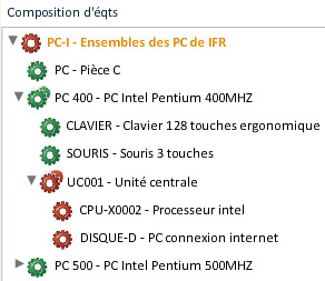 - soit en descendant les compositions, c'est-à-dire en affichant les équipements associés (GCEQ) à l'équipement sélectionné (option "fils") ;