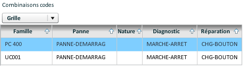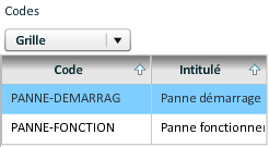 La liste des codes dépend de la position du curseur dans l'arbre des compositions. Les codes sont recherchés dans la gestion des associations diagnostic, panne, réparation et nature (GDPR) pour l'équipement ou éventuellement la famille sélectionné.