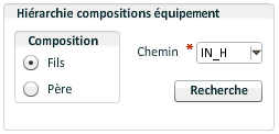 Lorsque la composition "père" est sélectionnée, la composition affiche les équipements supérieurs en remontant les compositions d'équipements (GCEQ) avec le chemin sélectionné. Si la composition "fils" est sélectionnée, ce sont les équipements associés qui sont affichés.