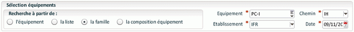 - une famille d'équipements ou un type d'équipement (dans le cas d'une recherche à partir d'une famille), la recherche s'effectue pour toutes les familles d'équipements et tous les équipements qui composent l'élément sélectionné ;