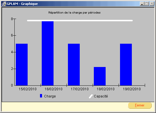 Permet d'obtenir un graphique reprenant les charges par dates sous forme de barres et la capacité représentée par une courbe. La période affichée est soit la période entière de calcul, soit la semaine courante.