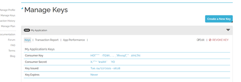 Après validation du formulaire, via le bouton "Create App", la liste des applications gérées s'affiche. Le bouton "Create a New Key" génère une clé d'accès au service. La donnée "Consumer Key" doit être reportée dans le texte de l'occurrence KEY.