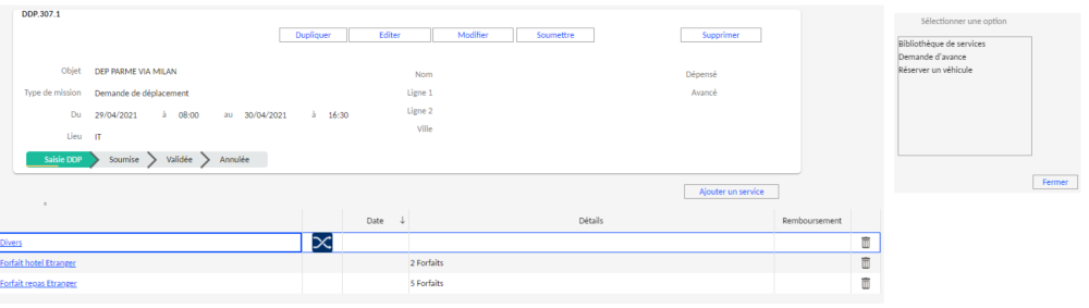 Pour un déplacement, il est possible d'ajouter la réservation d'un service, d'un véhicule de société et/ou d'effectuer une demande d'avance. Ces ajouts sont possibles depuis un menu accessible par le bouton "Ajouter un service". La disponibilité des options de ce menu est gérée avec les occurrences du paramètre AFFQDF.