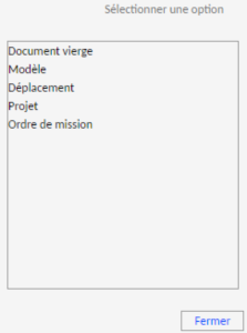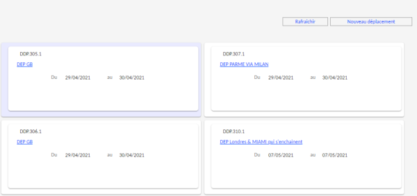 - le bouton "Nouveau déplacement". Ce dernier ouvre le menu contenant les options de création ;
