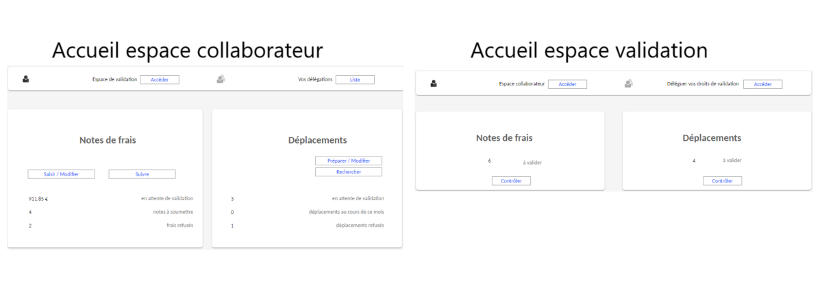Chaque espace possède son propre écran d'accueil divisé en deux sous-parties qui regroupent d'un côté les notes de frais et de l'autre les demandes de déplacement.