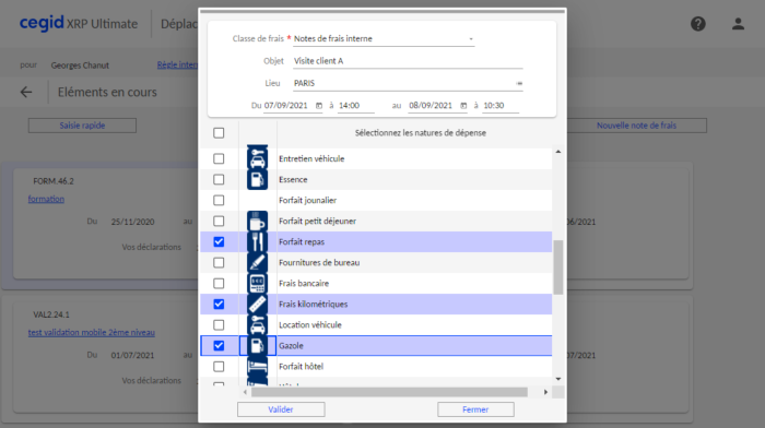 La sélection des frais s'effectue via un écran présentant les natures de dépense proposées par le modèle.