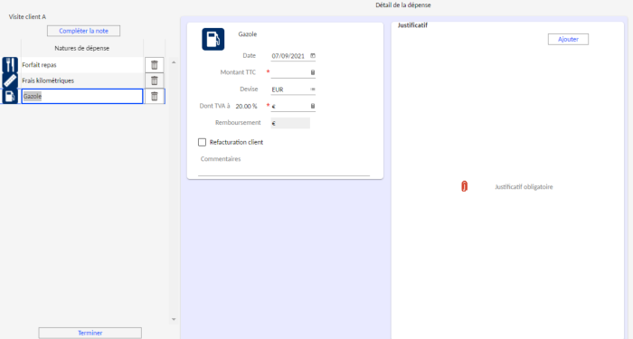 Après la validation de cette sélection, l'utilisateur est automatiquement dirigé vers un écran permettant de compléter chaque dépense.