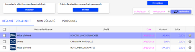 Cet écran permet de déclarer des éléments issus d'un relevé de cartes affaires préalablement intégré. Il est accessible à partir du menu "Ajouter un frais".