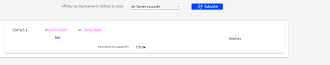 Cet écran propose la synthèse d'un déplacement en regroupant des données de l'en-tête et les avances et/ou réservations associées.