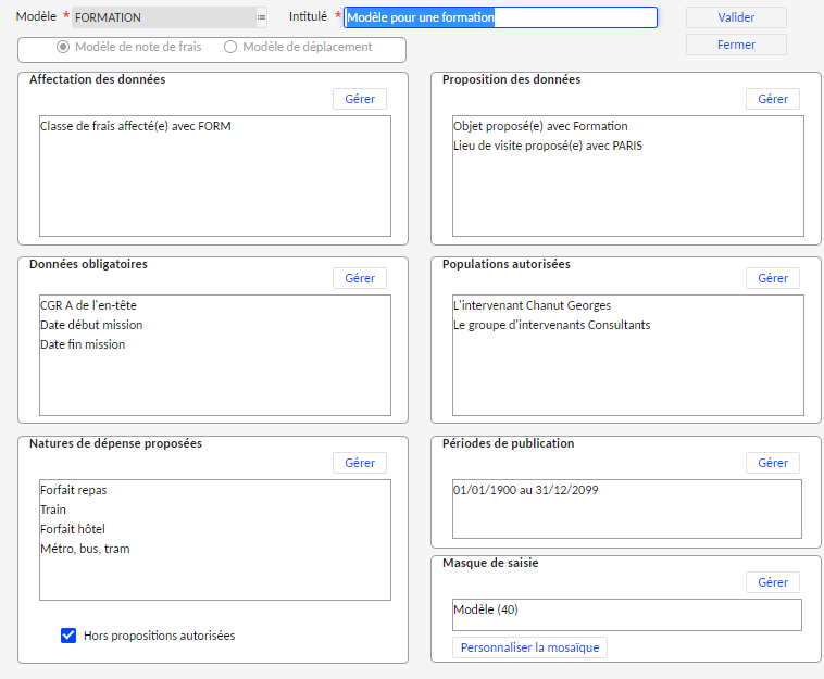 Les affectations ou les propositions de données, définies par le modèle, impactent seulement l'en-tête de la note de frais ou de la demande déplacement.