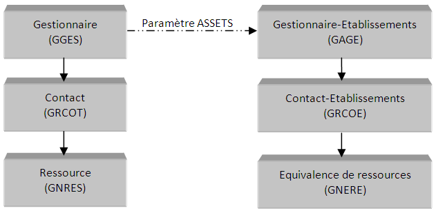 Lors de la création d'un gestionnaire (GGES), il est possible de créer automatiquement un contact (GRCOT) correspondant. Dans ce cas, lors du rattachement de ce gestionnaire à un établissement (GAGE), l'association contact-établissement (GRCOE) est générée.