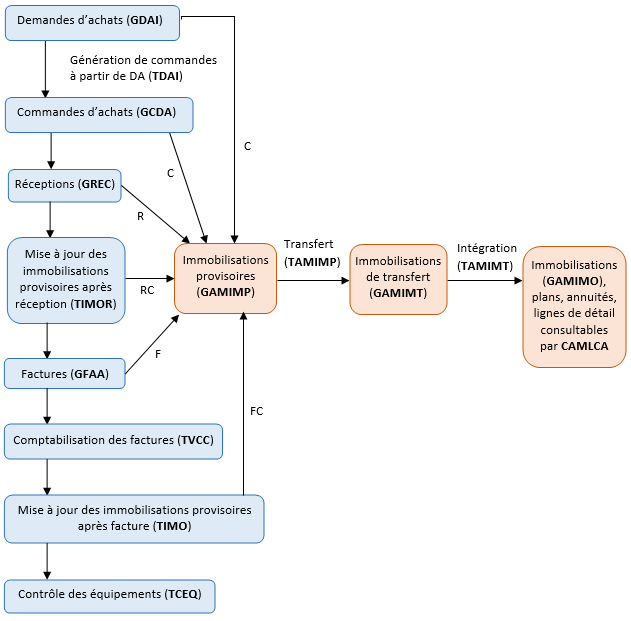 Une fois les fiches d'immobilisations provisoires créées, un traitement après réception (TIMOR) et/ou après facture (TIMO) met à jour les fiches afin de renseigner les informations qui n'ont pu être affectées auparavant. Ces traitements mettent respectivement le code traitement des fiches à "RC" et "FC".