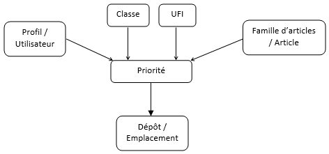 La priorité peut être saisie ou attribuée automatiquement. Dans ce dernier cas, elle est numérotée de 10 en 10 pour un établissement, un profil/utilisateur, une classe, une famille d'articles/article, un chemin et une unité fonctionnelle interne.