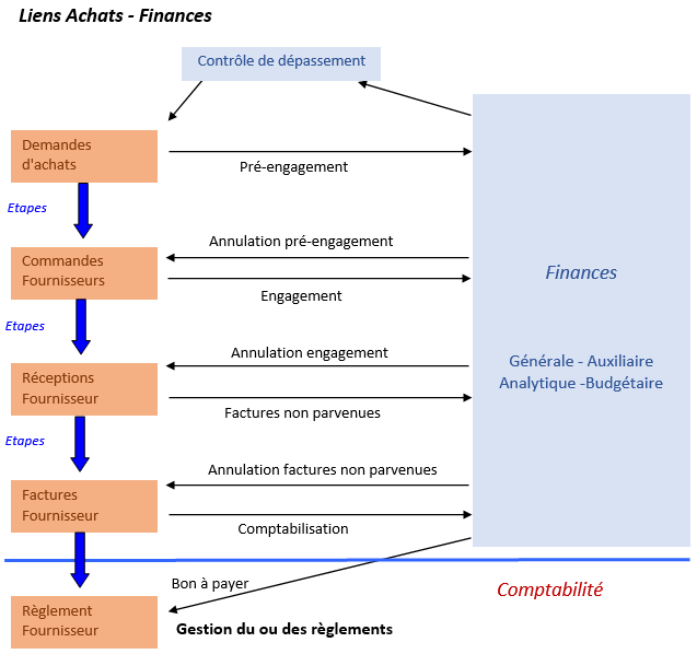 Les différents traitements de comptabilisation (pré-engagement, engagement, factures non parvenues, comptabilisation d'une facture) servent à faire le lien entre l'Application Achats et l'Application Finances, exemples :
