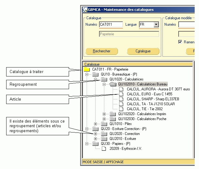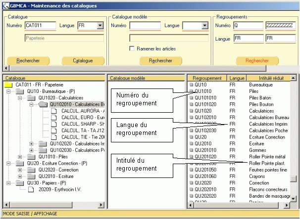 Le fait d'insérer un article sous un regroupement génère une association article-catalogue-regroupement (GBACR) et attribue ainsi un code catalogue à cet article.