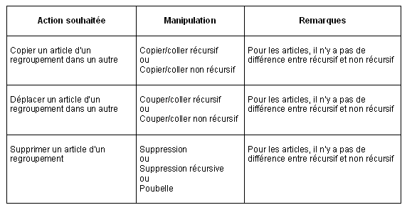 Supprimer un article d'un regroupement : il n'y a pas de différence entre supprimer récursif et supprimer non récursif. L'association article-catalogue-regroupement (GBACR) sera supprimée. Si ce regroupement est présent à un autre niveau dans le catalogue, il ne possédera plus d'article.
