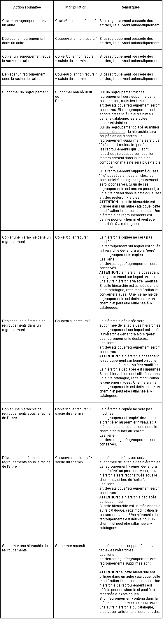 - si l'on supprime un regroupement et ses articles, même dans le cas où ce regroupement se trouve dans une autre hiérarchie (dans le même catalogue), le lien article/catalogue/regroupement sera supprimé.