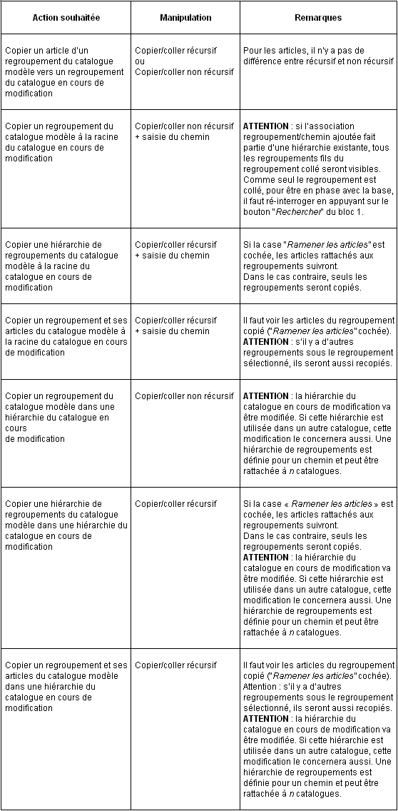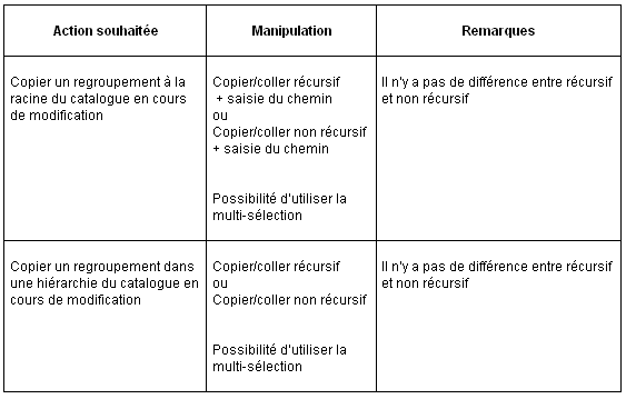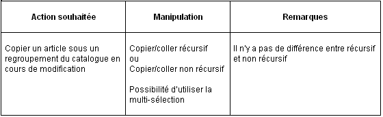 L'utilisateur peut seulement les copier et les coller sous un regroupement du catalogue en cours de modification.