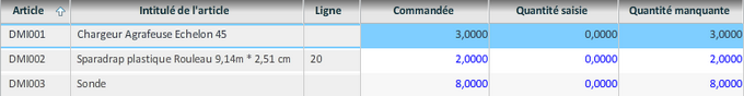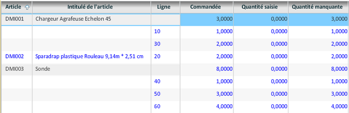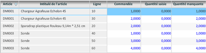 Les lignes des articles absents dans les commandes ou demandes sont aussi affichées. Elles apparaissent en rouge dans la consultation.