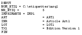 | ETQ_EX1 | Etiquette 1 v.1 | msq1 | 01/01/1900 | 30/04/2007 | 5 | IMP1 | Plan étiq. ou étiquette | Edition v1 | Réédition v1 |