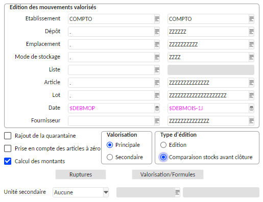 Paramètre AUTSTOCK occurrence DATCLO, établissement obligatoire, date 1 est égale à la date de clôture moins un jour.