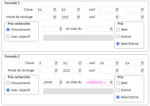 Si l'écart porte sur la période antérieure : on génère des mouvements avec la classe de stock saisie à la soumission. Les comptes et CGR proposés sont ceux paramétrés au niveau de la classe. Les mouvements sont transférés en comptabilité à la date de clôture. Les lignes sont calculées pour chaque article, dépôt et mode de stockage. Le montant est égal au stock calculé à la date de début multiplié par l'écart entre le nouveau et l'ancien prix standard.