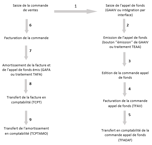 Principe de fonctionnement : après avoir été saisi, l'appel est émis, puis généralement édité, et ensuite facturé et transféré en comptabilité. L'émission d'un appel se traduit par la création d'une commande appel de fonds sur une classe de commandes dédiée. Parallèlement, la commande à laquelle l'appel est rattaché est facturée. La facture et l'appel de fonds sont associés pour que le montant de l'appel soit déduit du montant de la facture. La facture et l'association (ou amortissement) sont ensuite transférées en comptabilité.